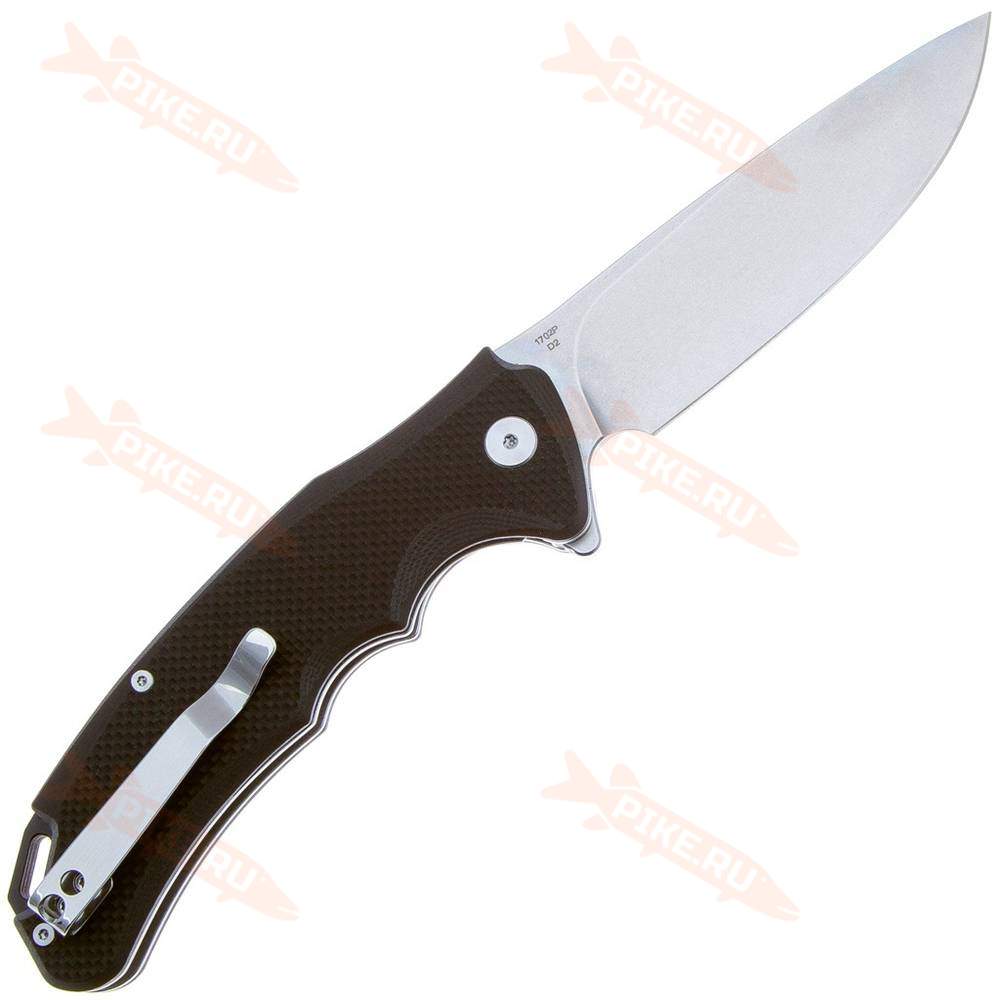 Материал клинка D2 — это одна из самых популярных ножевых сталей в мире. Она содержит 12% хрома, что не позволяет называться нержавеющей, но всё же она достаточно хорошо противодействует коррозии. Из положительных характеристик стоит так же отметить, что она хорошо держит режущую кромку острой и обладает неплохой ударной вязкостью.