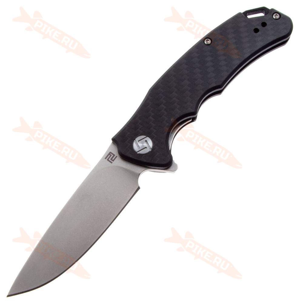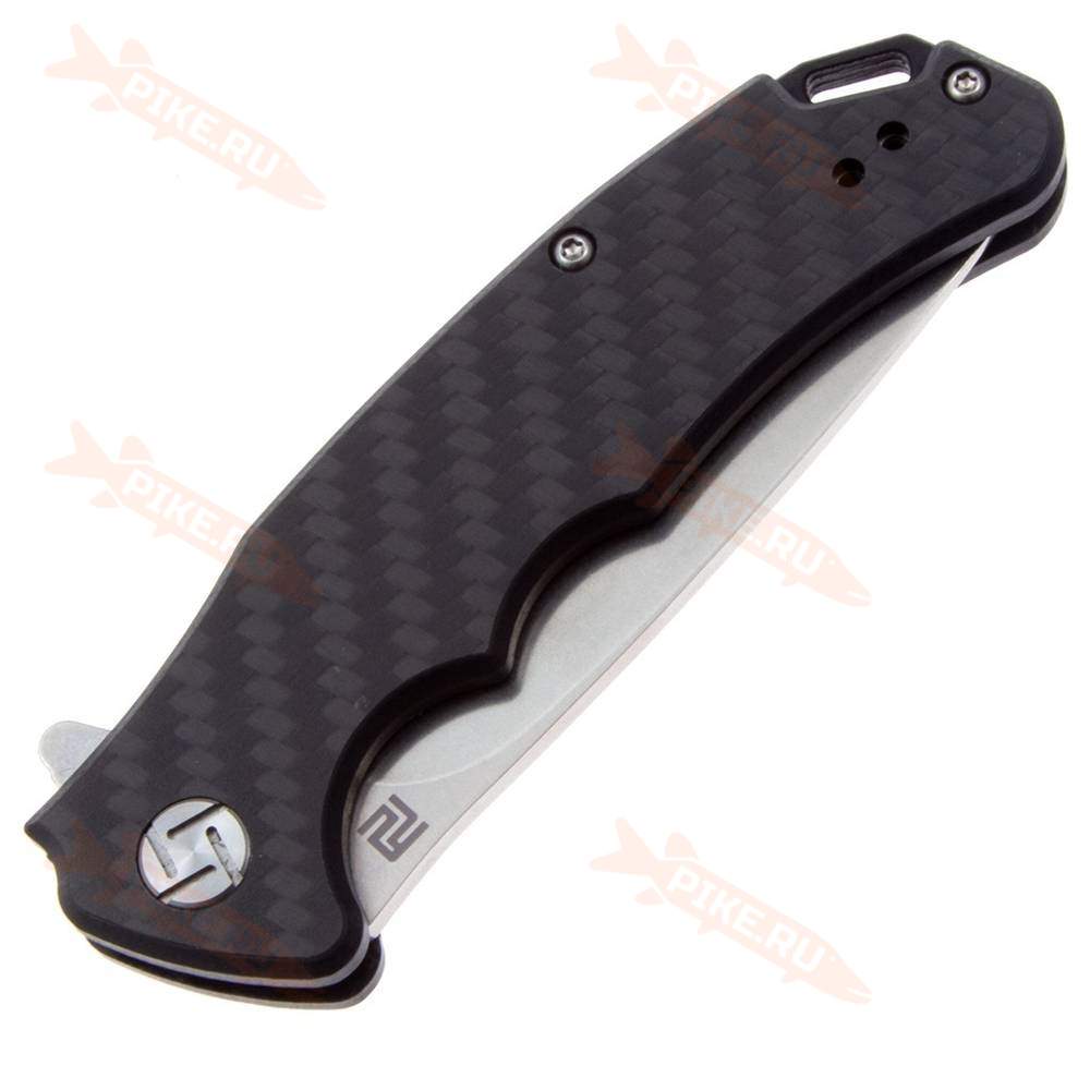 Нож ArtisanCutlery Tradition с клинком из стали D2 и имеет обработку StoneWash. Раскрытие клинка лёгкое и выполняется с помощью шпенька. Осевой узел выполнен с использованием керамических шарикоподшипников. Фиксируется клинок замком типа Liner-lock. Рукоять ножа выполнена из карбона. Нож оснащён карманной клипсой из стали для удобства в фиксации при ношении.
