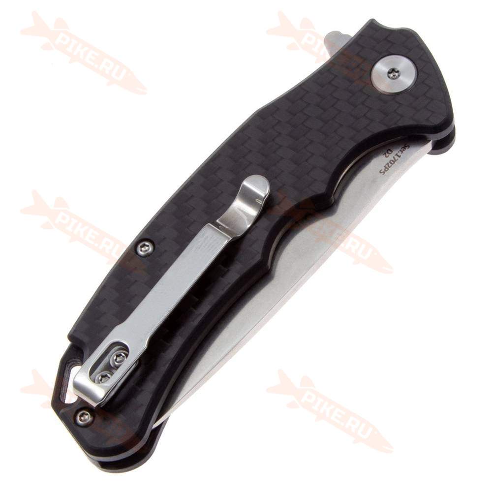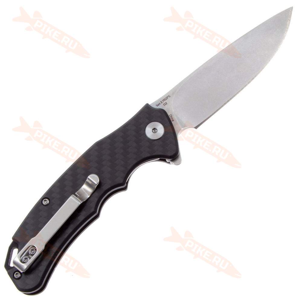 Рукоять изготовлена из карбона — это довольно дорогой, но невероятно прочный материал. Он очень лёгок и не боится влияния химических реагентов. Переплетения карбоновых нитей, вырисовывают уникальную текстуру, поэтому карбон прочно обосновался в сегменте аксессуарных и джентльменских ножей.