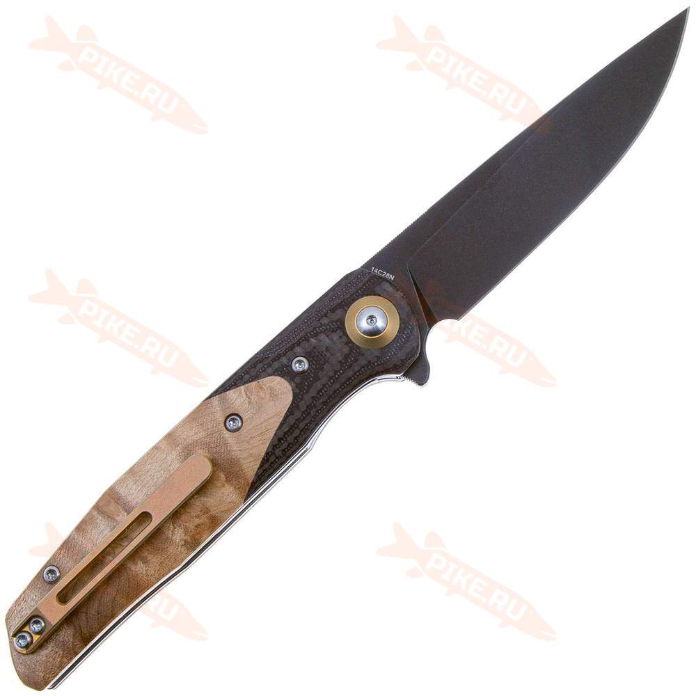 Рукоять изготовлена из дерева, больстер выполнен из смеси карбона и G10. Стеклотекстолит G10 — это композитный материал на основе стеклоткани и эпоксидной смолы. Он является очень прочным, влагонепроницаемым и ударостойким. Прекрасно поддается обработке и окрашиванию. Используется повсеместно на всех современных ножах.