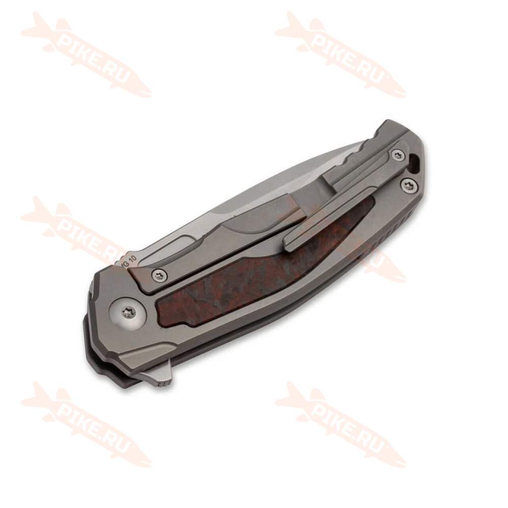 Нож обладает удобной рукоятью из титана с карбоновыми вставками с красивым узором, чем-то похожим на мрамор. Carbon fiber — углеволокно применяемое в различных сферах промышленности, в том числе и при создании рукоятей для ножей. Это приятный и лёгкий, но одновременно с этим и прочный материал.