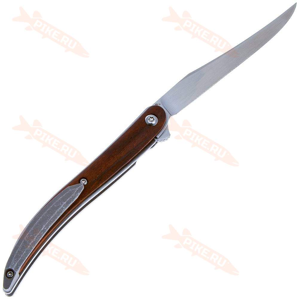 Нож Boker Texas Tooth Pick Flipper Cocobolo — джентльменский нож, выполненный в техасской стилистике и отдалённо напоминающий нож наваху. Этот нож был крайне популярен в 19 веке и использовался с разными целями, от сельскохозяйственных дел, до очистки и разделки рыбы. Этому способствует тонкий длинный клинок, чем-то напоминающий зубочистку. Клинок извлекается с помощью флиппера. Рукоять выполнена из тёмной древесины кокоболо, оснащена удобной стальной клипсой. Этот джентльменский нож отлично подойдёт не только для сельскохозяйственных задач, но и для EDC в городе.