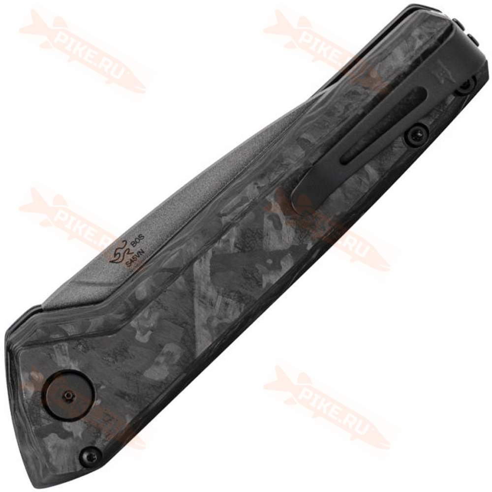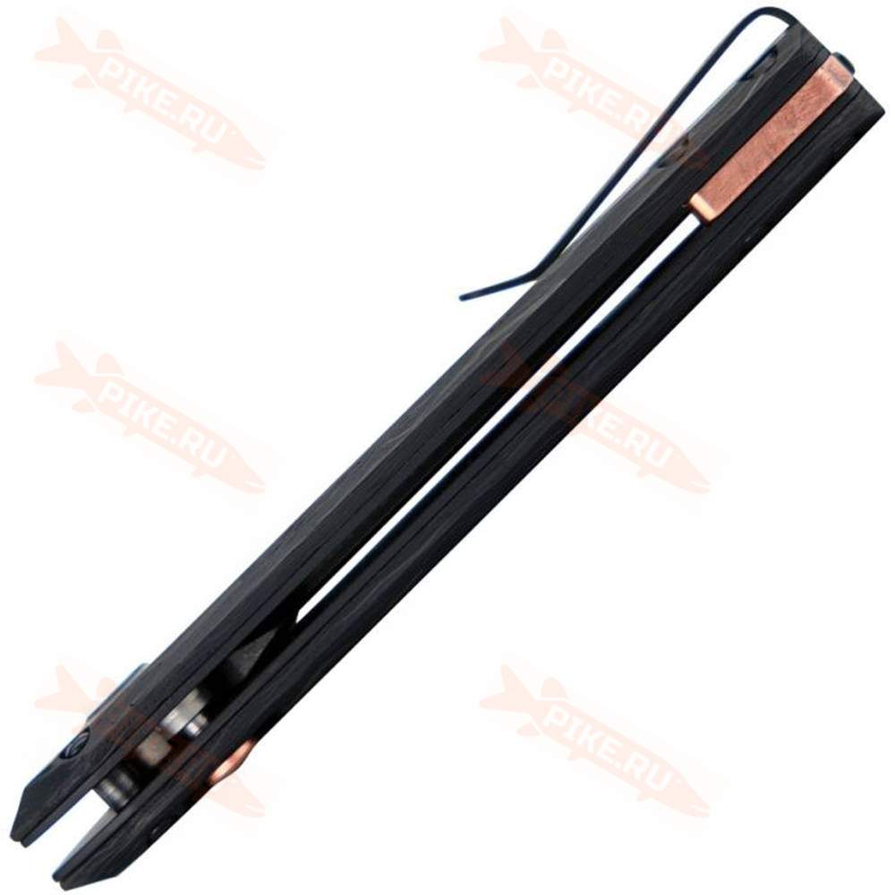 Гладкая 13-сантиметровая рукоятка из мраморного углеродного волокна с медной проставкой и кнопкой безопасности. Автоматический замок. Съёмная и переставляемая карманная клипса с покрытием Cerakote.