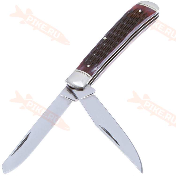 Нож Cold Steel FL-TRPR-J Trapper оснащён двумя клинками с профилями Clip-Point и Drop-Point из стали 8Cr13MoV. Ручки выполнены из натуральной кости и украшены полированными металлическими больстерами. Он изготовлен по традиционному образцу ножа Jack Knife с двумя полированными клинками: клинок для прокалывания и разрезания, а также клинок для снятия шкур и потрошения.