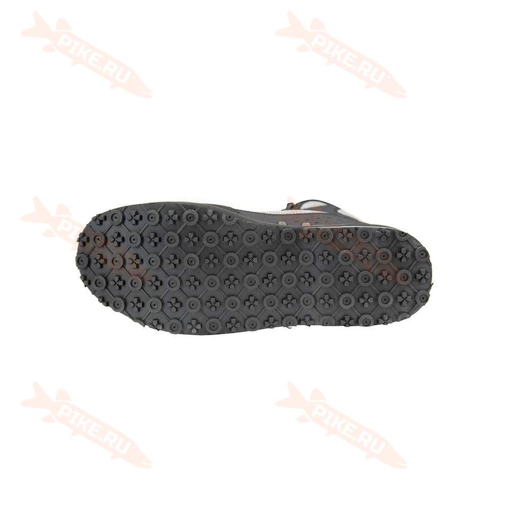 Подошва комбинированного типа имеет амортизационную прослойку из материала EVA и одинаково хорошо "держит" на глинистых берегах и на камнях, предусмотрена возможность вкручивания шипов.