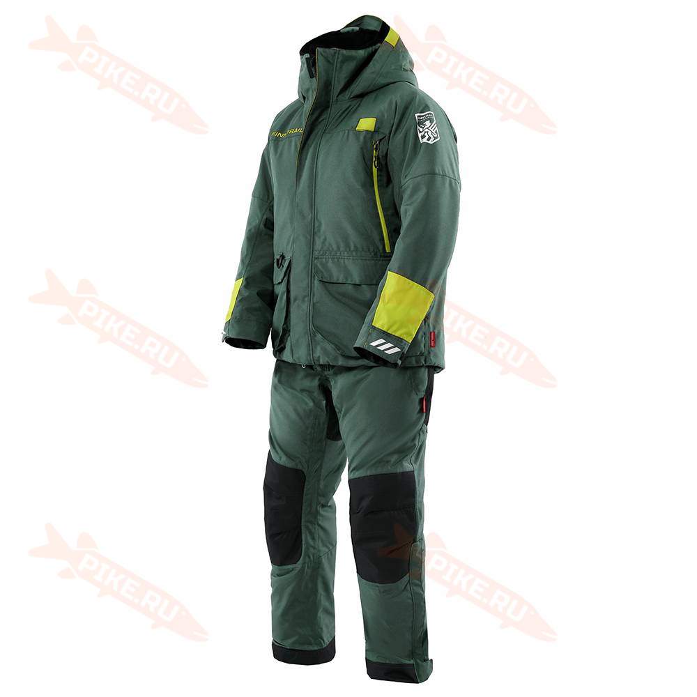 В местах подверженных наибольшему износу и давлению, у комбинезона дополнительное усиление из сверхпрочного материала Cordura: область коленей, седалища и низа штанин.Капюшон у куртки регулируется по объёму в 2 плоскостях, есть внутренняя регулировка по талии. От проникновения ветра и влаги защищает центральная двухзамковая влагозащитная тракторная молния с ветрозащитной планкой и дополнительной подпланкой. Для удобства использования у куртки есть два нагрудных «тёплых» кармана с влагозащитными молниями и два боковых объёмных кармана с защитными клапанами. Слева на груди расположена удобная петля для крепления рации. Есть один внутренний карман на молнии с дополнительным отверстием и петлёй для наушников и один объёмный внутренний карман из сетки с эластичной резинкой по краю.