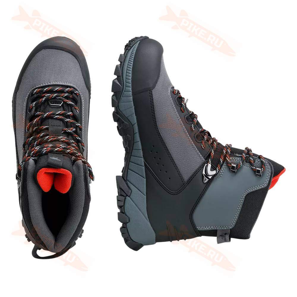 - Высокая конструкция ботинок с дополнительными резиновыми накладками в зоне голеностопа обеспечивает надёжную фиксацию и защиту от вывихов при активном передвижении по влажному и нестабильному грунту.