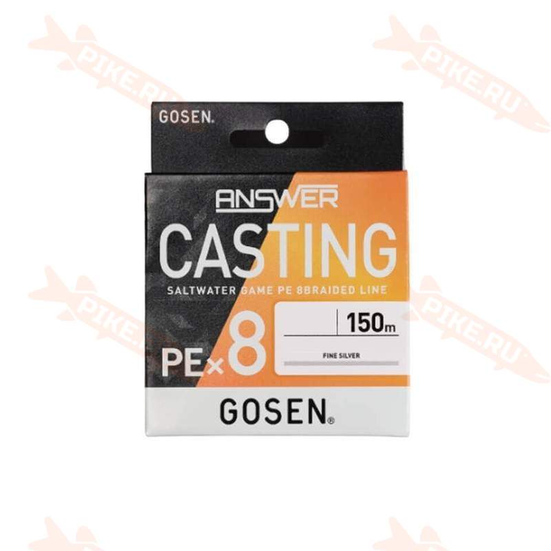 Шнур GOSEN Answer Casting PE×8 150m #0.8 PE, Fine Silver - серия восьмижильных плетёных лесок от японской компании. Это специализированный шнур, разработанный для ловли кастинговой снастью. Отлично подходит как для морской, так и для пресноводной рыбалки.