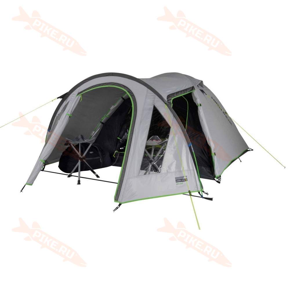 Палатка High Peak KIRA 3 для путешествий с большим количеством снаряжения или велосипедами. Выносная дуга формирует обширный тамбур для хранения любого снаряжения, в том числе и кухни.
