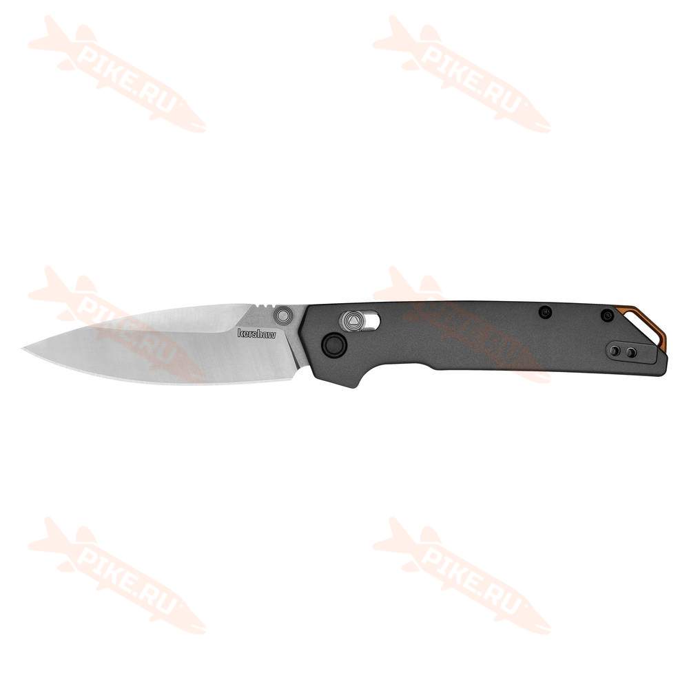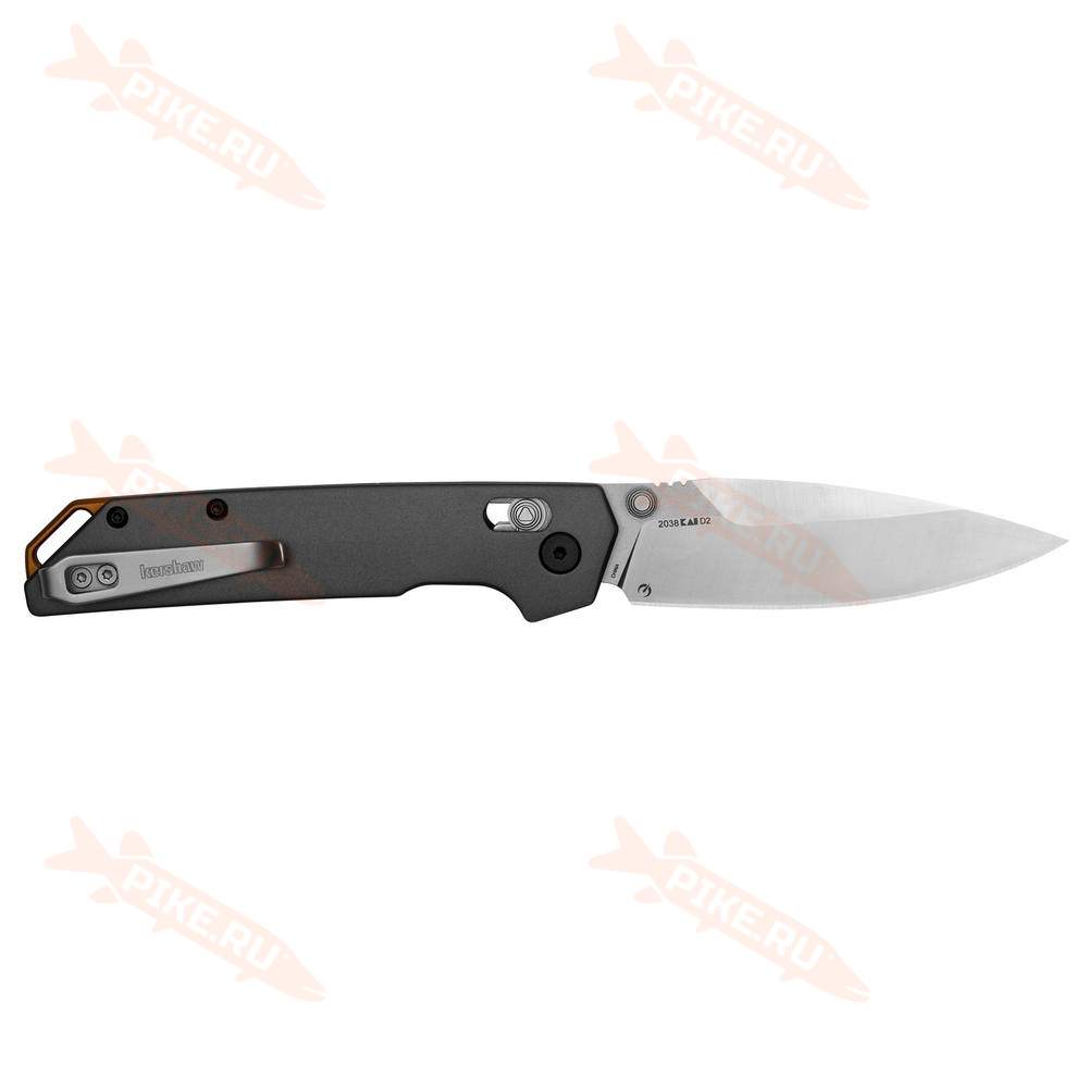 Клинок выполнен из прочной инструментальной стали D2 в форме spear-point с сатиновой обработкой, на обухе имеется рифление для упора при выполнении точных работ. Извлечение клинка происходит при помощи двухстороннего шпенька, плавный ход достигается при помощи системы Kershaw Velocity Technology. За фиксацию в открытом положении отвечает замок crossbar-lock, которым можно пользоваться как левой, так и правой рукой.