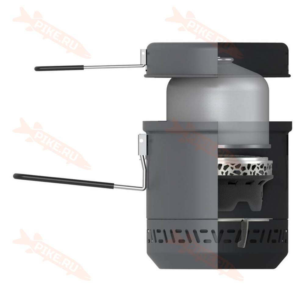 Комплектация: алюминиевый анодированный котелок с интегрированными теплообменником и ветрозащитой, крышка-сковородка со складными ручками, два транспортировочных чехла, складная подставка под варочную посуду.