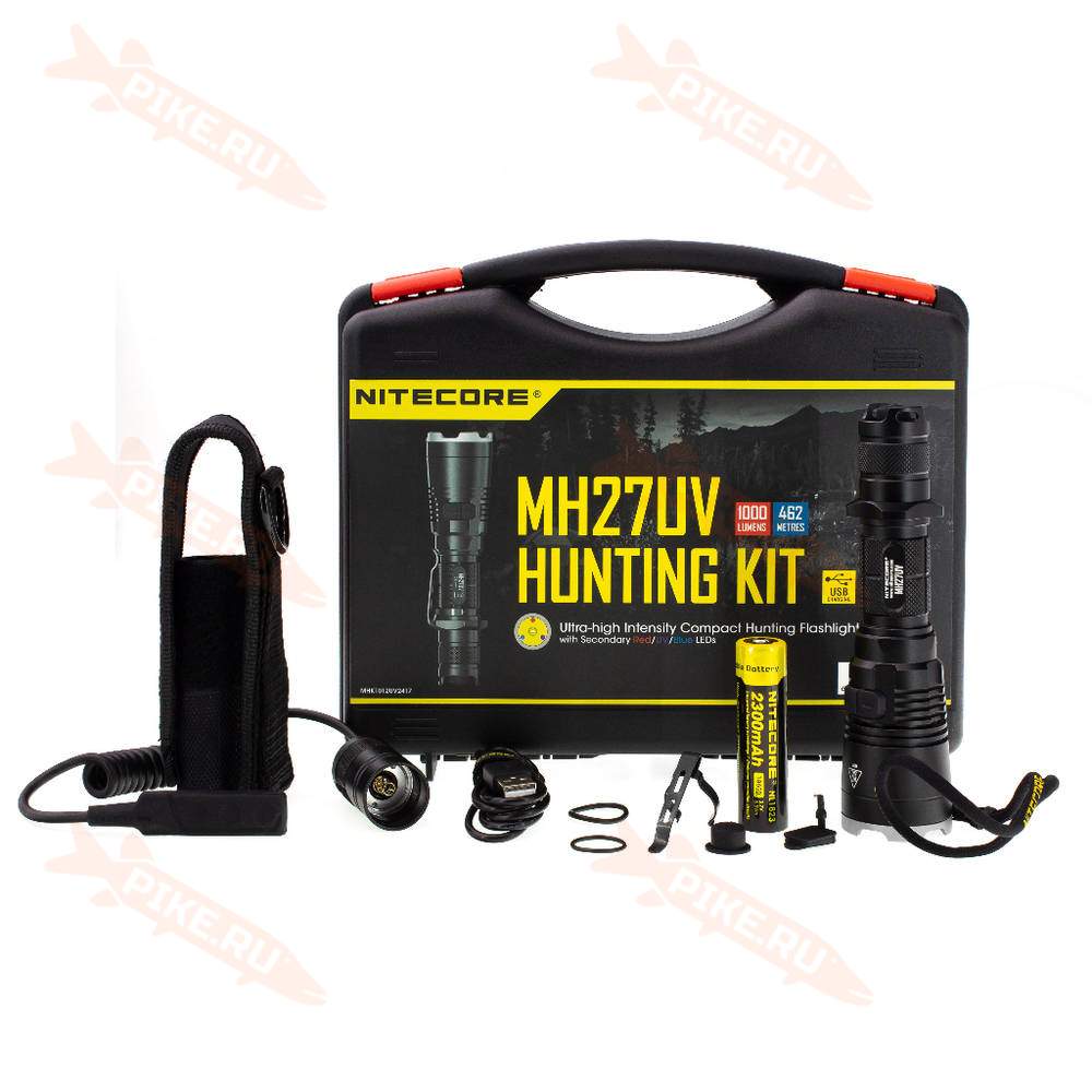 Фонарь Nitecore MH27UV HUNTING KIT - непревзойдённый набор всего самого необходимого для комфортной охоты! Удобный кейс надёжно защищает фонарь и все аксессуары во время транспортировки, предотвращая потерю и повреждения. В комплект Hunring Kit, помимо фонаря, входит: