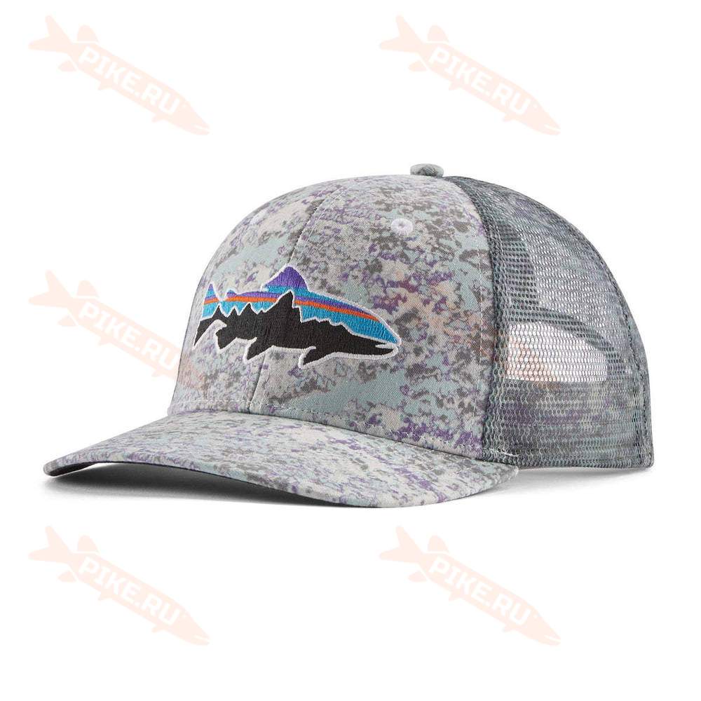 Кепка Patagonia Fitz Roy Trout Trucker Hat дальнобойщика из шести панелей и сетчатой вставкой сзади. Сетка из полностью отслеживаемых рыболовных сетей NetPlus 100% переработанных Bureo. Имеет органический хлопок спереди, переработанную полиэстеровую сетку сзади и регулируемую застёжку-кнопку. Изготовлено на фабрике, сертифицированной по стандарту Fair Trade Certified.