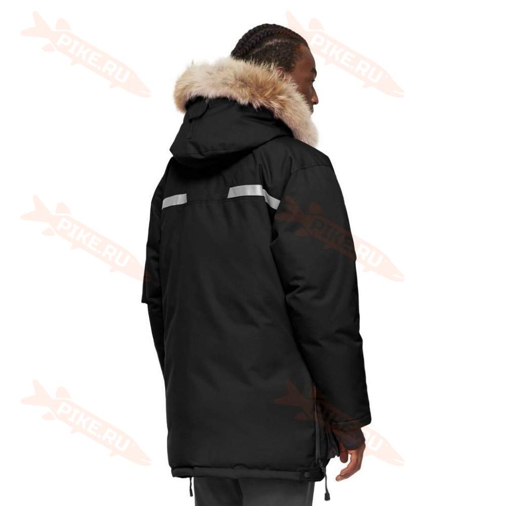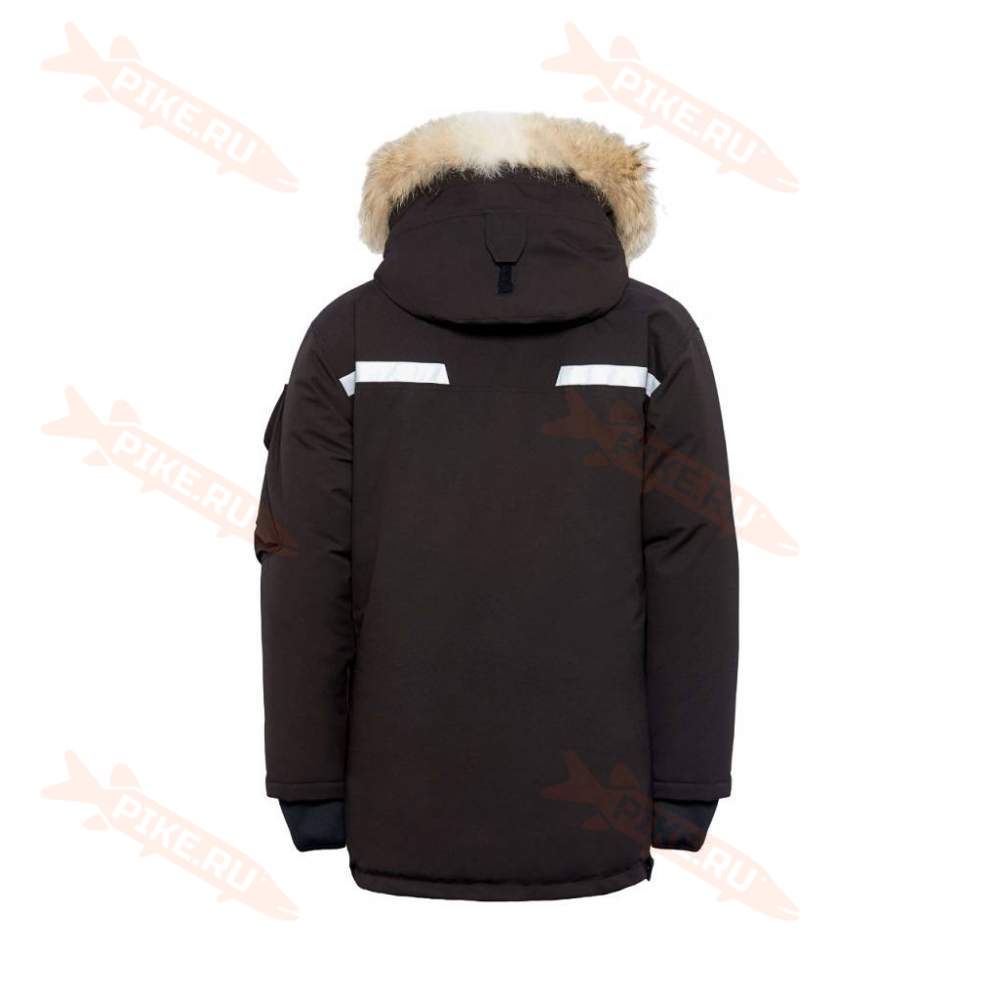 - Конструкция: двухсторонняя молния, регулируемые манжеты, отстёгивающийся капюшон с отстёгивающейся опушкой из меха койота, регулируемые талия и низ куртки.