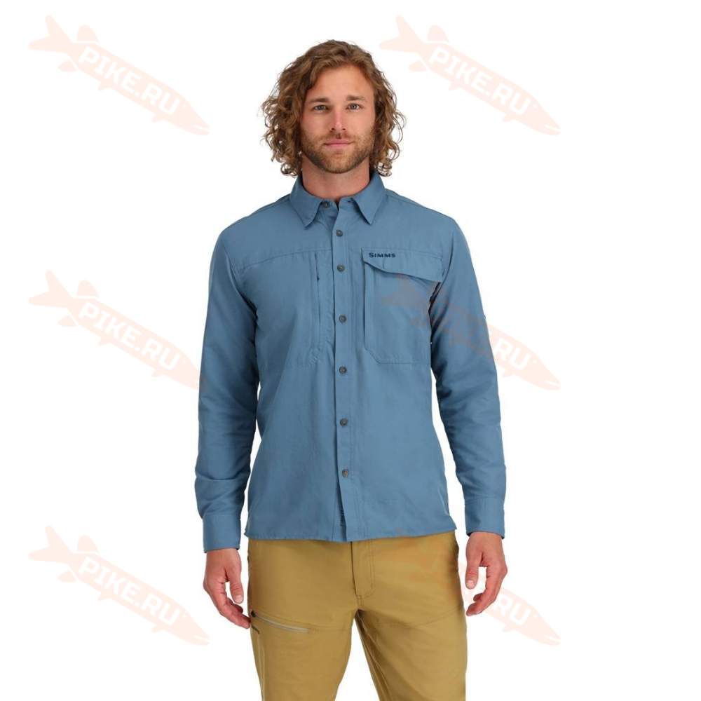 Рубашка Simms Guide Shirt для профессиональных рыболовов с надёжными карманами, регулируемыми рукавами и прочной быстросохнущей тканью для комфорта на рыбалке.