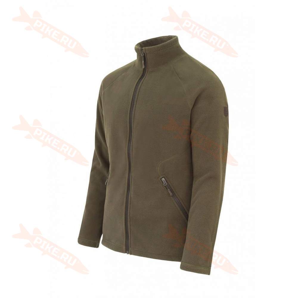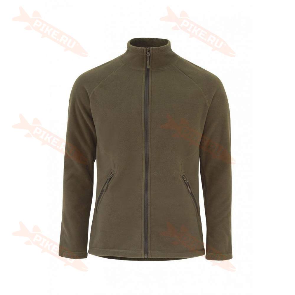 Мужская флисовая кофта прямого силуэта с рукавами реглан, с центральной застёжкой на молнию. Низ кофты, низ рукавов, верхний срез воротника-стойки перегнут на лицо и отстрочен декоративной строчкой.